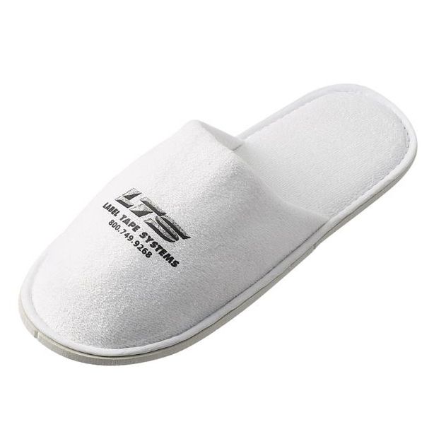 Plush white cotton velour slipper with closed toe in medium one fits all size, packed in convenient and reusable non-woven drawstring bag.