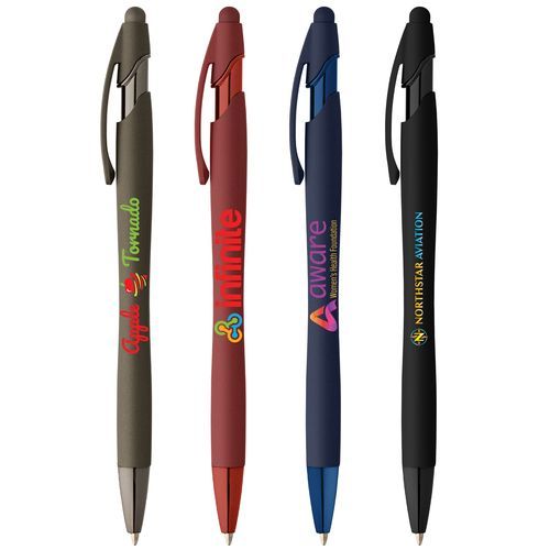- This medium black ballpoint pen also features a touchscreen stylus at the top, making this the perfect 2-in-1 promotional gift.