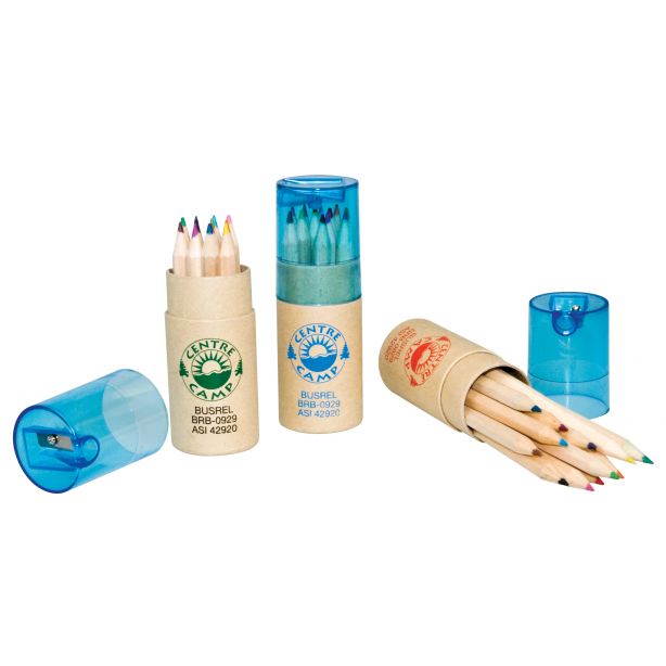 Cylinder box made of recycled cardboard containing twelve colored wooden pencils with integrated sharpener in the translucent colored plastic cover. Non toxic.