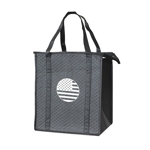 - Imprint on our multi-use reusable 90 GSM non-woven polypropylene tote - foil insulated, heat-sealed water-resistant interior lining, dual reinforced 20" handles and a zippered main compartment.