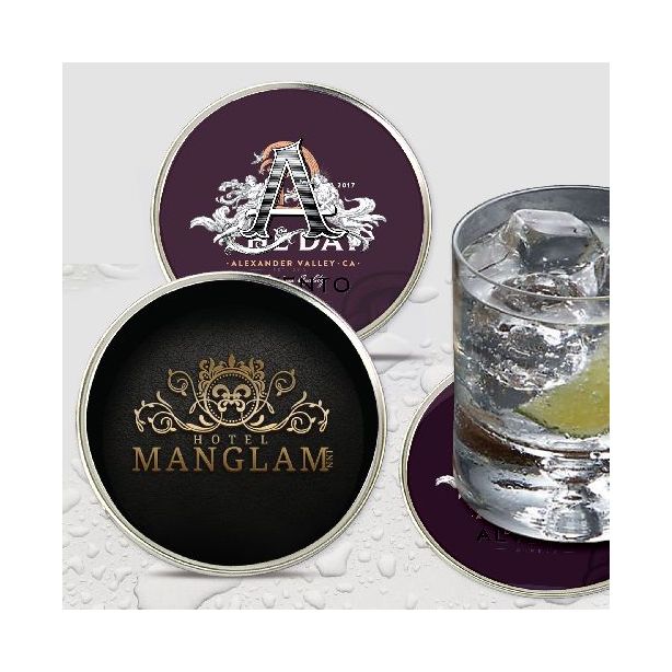 Each coaster features a sophisticated brushed silver finish on its aluminum base, adding a touch of modern elegance. The custom photoart label allows for intricate, full-color reproduction of any image, logo, or artwork (3.25" diameter imprint area), with precise PMS color matching available within CMYK capabilities for brand consistency. Perfect for corporate gifts, wedding favors, milestone celebrations, or retail merchandise, these coasters come individually packaged in a dedicated coaster box (4" x 4"), making them gift-ready and enhancing their premium feel.