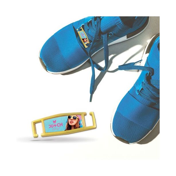 Custom shape shoe lace charm with one colour fill plus one colour print or photoart laminated label.