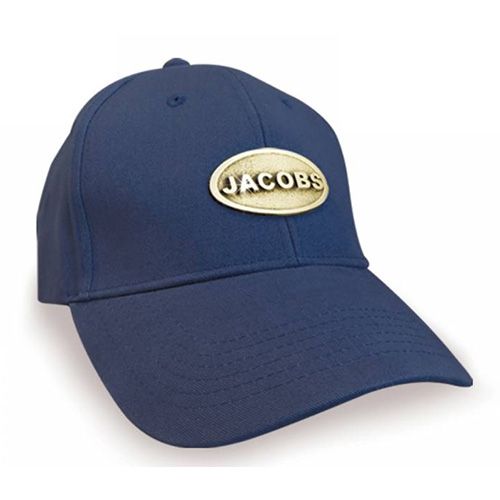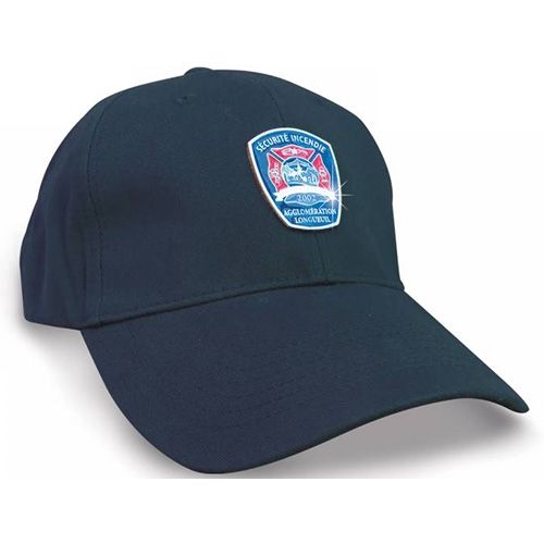 Custom shape 2D emblem mounted on a 6 panel cap made of brushed cotton and semi low profile style. Caps available in Black or Navy.