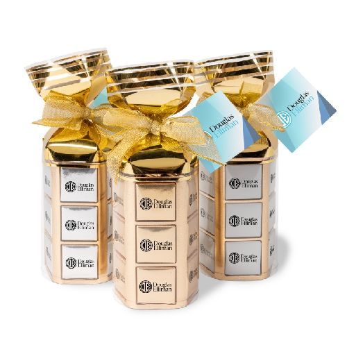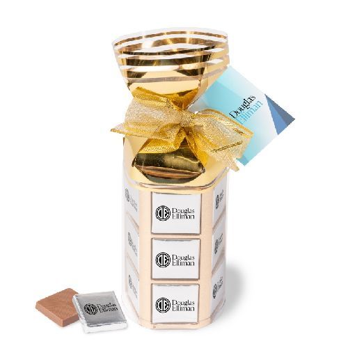 The chocolate tower comes beautifully presented in a classic gift bag, complete with a coordinating bow, enhancing its appeal as a high-end present. Your brand will shine with a full-color custom hang tag attached to the bag, featuring your logo or message. Additionally, a subtle yet effective pad print of your brand (1" W x 1" H imprint area) can be added directly to the chocolate wrappers, with foil color options of gold, silver, and white for the chocolates, ensuring a cohesive and sophisticated branded gift. Standing at 2 3/4" W x 7 1/2" H, this chocolate tower makes a memorable statement, ideal for corporate appreciation, holiday gifts, or client thank-yous.