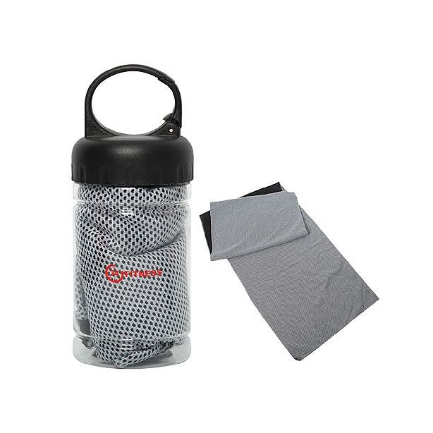 Available with a Clear bottle body (often with various colored lids/carabiners) and the cooling towel in Grey (other towel colors like Blue, Red may be available, please inquire), this set offers a sleek and practical canvas for your custom branding.