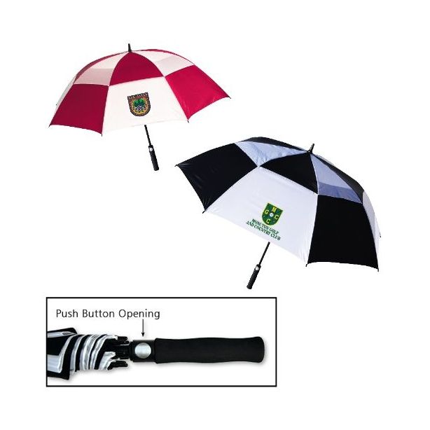 Available in two-tone colors including black/white, navy/white, royal blue/white, and red/white, this umbrella provides an excellent backdrop for your custom branding.