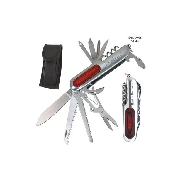 The Handyman Collection 14-function stainless steel multi-tool Features a coloured wood insert Packaged in nylon pouch with Velcro closure and belt loop.