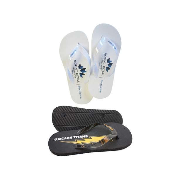 Send your prospects on vacation in our traditional flip flops! Made from 15mm (9/16") EVA foam, these sliders come with a choice of white or translucent black straps and treaded bottoms. Imprint is printed on insole, with an optional second imprint available on each strap. Perfect for beach retailers, pedicurists, spas, hotels, hospitals and health clinics.