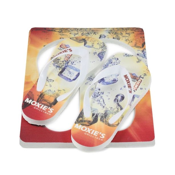 Flip flops are a summer must-have so why not have your business showcased this year with your imprinted logo? These 15mm (9/16") sliders come in a range of classic colour options with accenting straps and threaded bottoms. These premium pieces are presented polybagged in their frame with full colour print on platform and one colour print on straps.