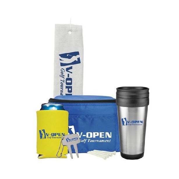 * Price includes a 1 color imprint on one location on 14oz Stainless Steel Budget Tumbler, Steel Divot Tool, Tri-Fold Golf Towel, Two sided Folding Foam Can Cooler, set of 4 golf tees all placed inside a 6 Pack Cooler Bag. (tees are not imprinted)