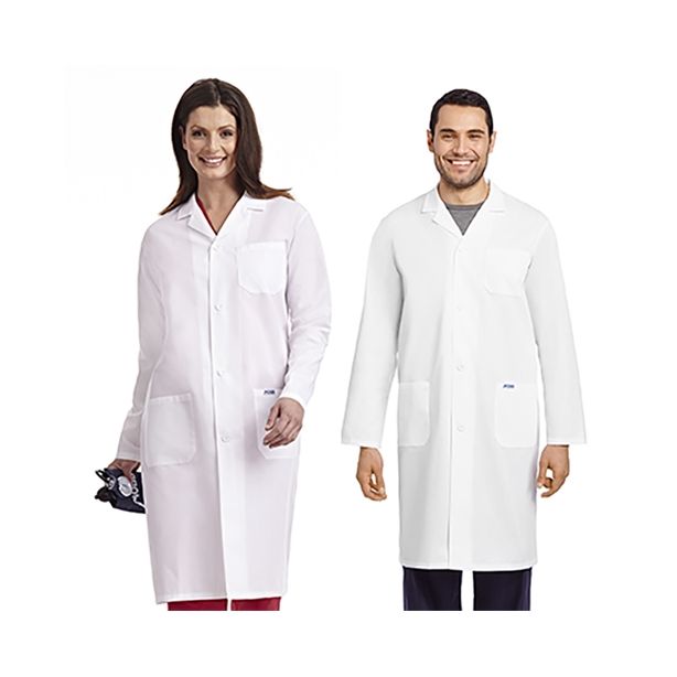 - Standard button front full length lab coat with two patch pockets, access slits and one breast pocket
