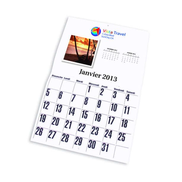 * Base pricing includes a 12 sheets / 24 pages 80 lbs paper stock calendar (inside) and 8-pt card stock cover, stapled and folded, displaying 12-month (1 month on 2 pages when opened), 4 colour process imprint on cover and one 4 colour process image for each month. Choose from our 3 different models available in French, English or bilingual. MODEL 1 CAM1116S1 - Choose 12 different square shaped stock images from our website. MODEL 2 CAM1116S2 - Supply 12 square shaped custom images. MODEL 3 CAM1116S3 - Supply ready-to-print artwork.