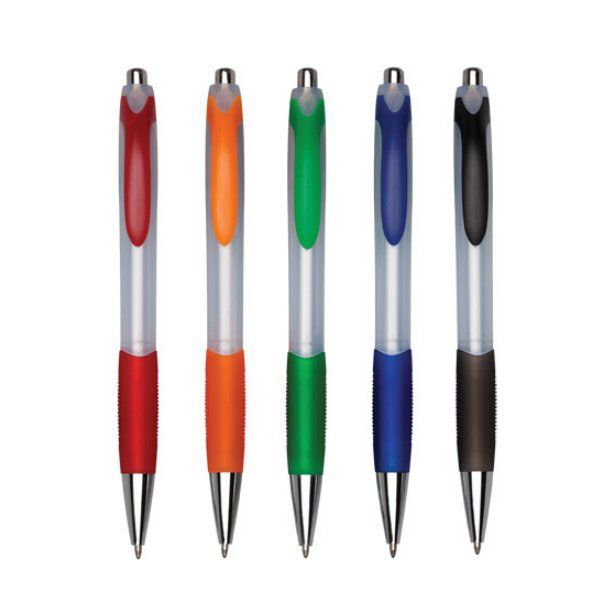 Plastic click-action ballpoint pen with coloured trim and textured plastic comfort grip.