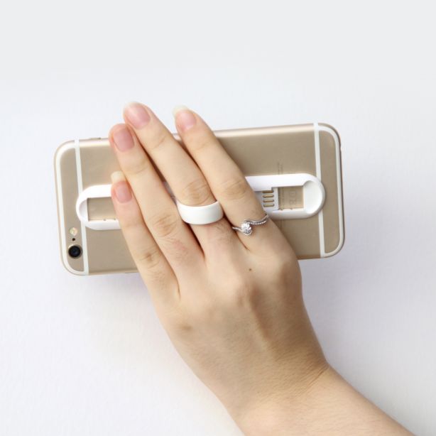 Stick this item to the back of your phone to use it as a phone holder in your hand or on your desk. Next to this the item offers a usb charging cable so you will be able to charge your phone whenever you are close to a usb port. The charging cable has a double function connector to be able to use it as micro usb or lightning adapter.