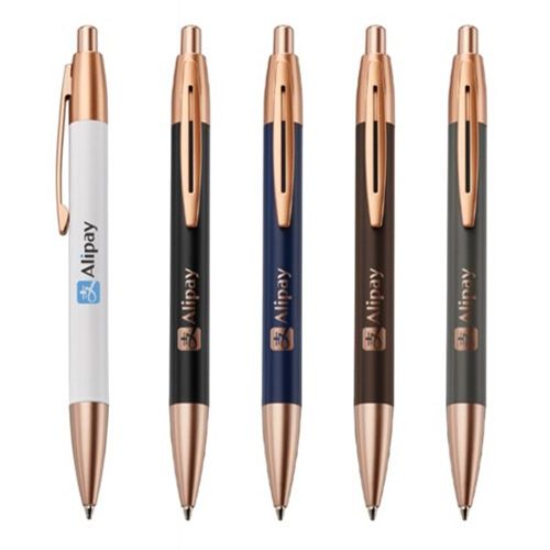 Metal ballpoint pen with rose gold trim.