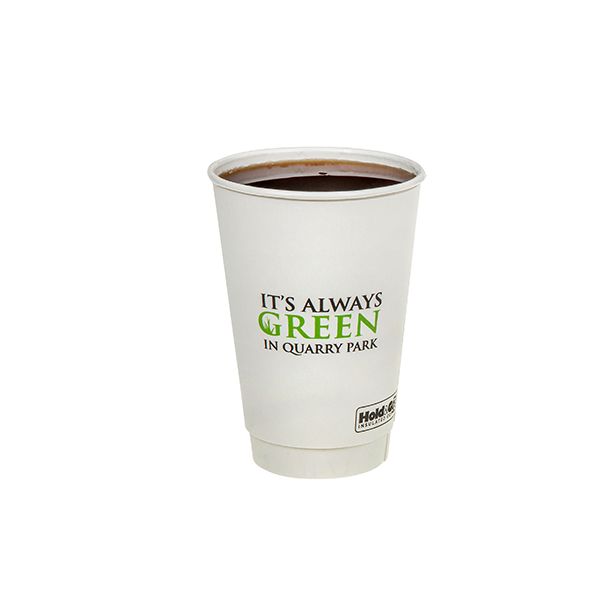 There is no need for double cupping or using a sleeve. The cups are preprinted in black with a "Hold 'n' Go" symbol along the bottom and text along the seam.