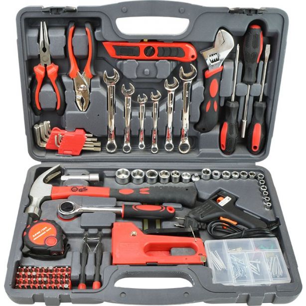 - Includes needlenose/slip joint pliers, utility knife,adjustable wrench, Phillips/Flathead Screwdrivers, magnetic bit drive and 40 piece bit set, 6 piece wrench set, 9 piece Allen wrench set, 20 piece ratchet set, fibreglass handle claw hammer